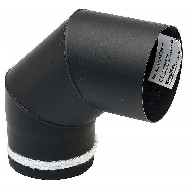 Sort knærør 90° med smig og keramisk pakning. Anvendes hvor retningen skal ændres på røgrøret. Knærør med smig kan anvendes alene eller man kan sammensætte flere knærør. Med indvendig diameter Ø80 mm. Knærøret er lavet i 2 mm stålplade og er sortlakeret.