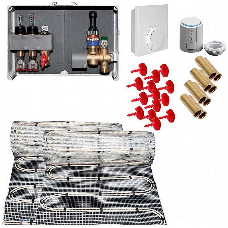 10 kvm med 230V rumtermostat.Neotherm Miniheat komplet gulvvarmesystem med lav indbygningshøjde. Neotherm Miniheat er et gulvvarmesystem der er særdeles velegnet i forbindelse med renoveringsopgaver i huse og i lejligheder samt til rum hvor der er en begrænset indbygningshøjde. En af de store fordele ved MiniHeat er at indbygningshøjden på lige omkring 2 cm inklusiv klinker. Og netop på grund af den meget lave indbygningshøjde kan MiniHeat gulvvarme lægges i faktisk stort set alle rum. MiniHeat er varmemåtter med 8 mm gulvvarmerør, der er fæstnet på et tyndt net. Dette net er lige til at rulle ud på gulvet. Når nettet er rullet ud tilsluttes slangerne til det eksisterende centralvarmesystem med en returventil eller reguleringsboks.