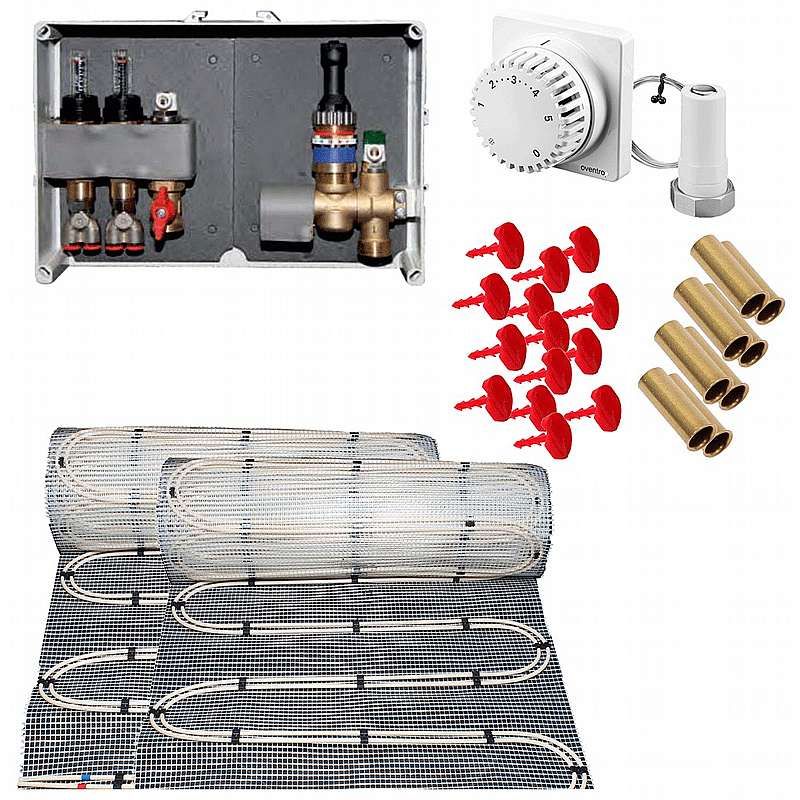 Miniheat komplet 10 kvm med termostat m/fjernføler. Lav indbygningshøjde. Neotherm Miniheat komplet gulvvarmesystem med lav indbygningshøjde er et smart gulvvarmesystem der er særdeles velegnet i forbindelse med renoveringsopgaver i huse og i lejligheder samt til rum hvor der er en begrænset indbygningshøjde. En af de store fordele ved MiniHeat er at indbygningshøjden på lige omkring 2 cm inklusiv klinker. Og netop på grund af den meget lave indbygningshøjde kan MiniHeat gulvvarme lægges i faktisk stort set alle rum. MiniHeat er varmemåtter med 8 mm gulvvarmerør fæstnet på et tyndt net. Dette net er lige til at rulle ud på gulvet. Når nettet er rullet ud tilsluttes slangerne til det eksisterende centralvarmesystem med en returventil eller reguleringsboks.