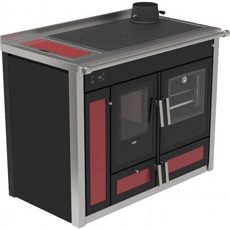 Klover Altea Plus brændekomfur i Sort & Rød med flotte rustfri profiler – 22 kW. Skab en helt ny stemning i dit køkken enten i sommerhuset, fritidshuset eller hjemme med dette meget fine brændekomfur. Flot kombination af opvarmning og madlavning på en og samme tid. Flot brændekomfur i sort støbejern med flotte røde detaljer og rustfri profiler. Kan opvarme mange kvm. Avanceret brændekomfur med vandbåren varme. Med støbejerns kogeplader og rummelig ovn i rustfrit stål. 2 glaslåger i front så der også er kig til ilden. Brændsel: Kløvet træ.
