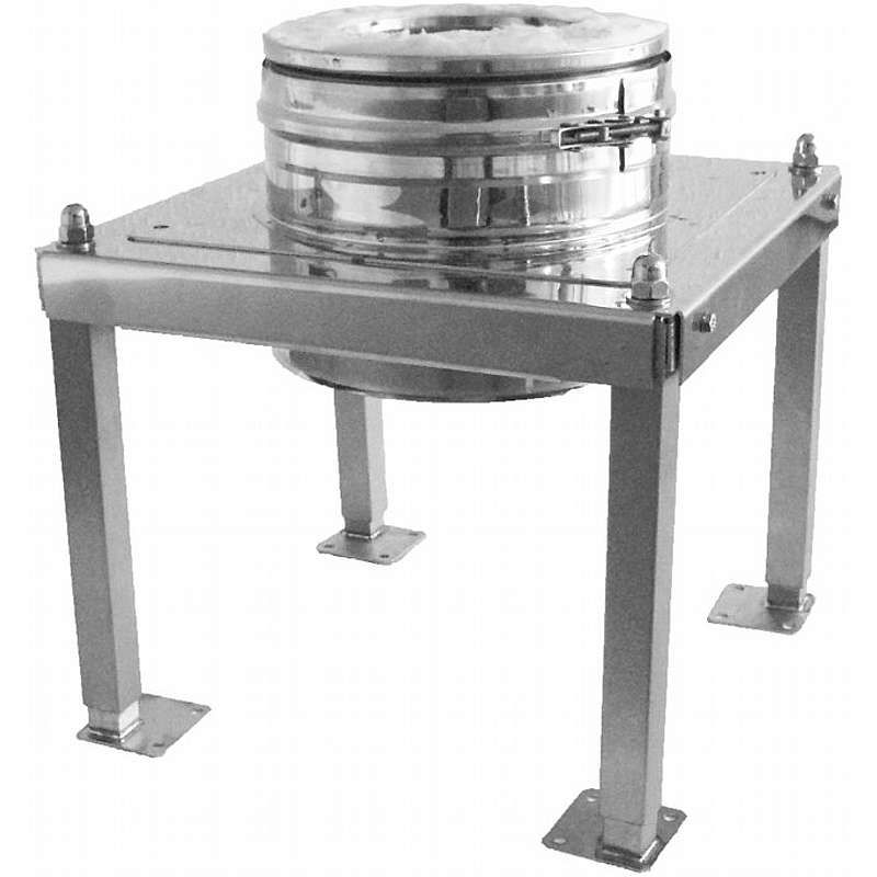 Multi25 Gulvbæring Teleskopisk (325-540) mm Ø150mm. Kan placeres frit bag indføringen og justeres nemt til den ønskede højde, hvor den fastlåses sikkert. Ved behov for yderligere højde, kan der indskydes en skorstenslængde mellem gulvbæring og T-stykke. Rensning og inspektion klares let ved at fjerne sodskålen, som er placeret under gulvbæringen. Låsebånd medfølger. Maksimal bæreevne er 10 meter.