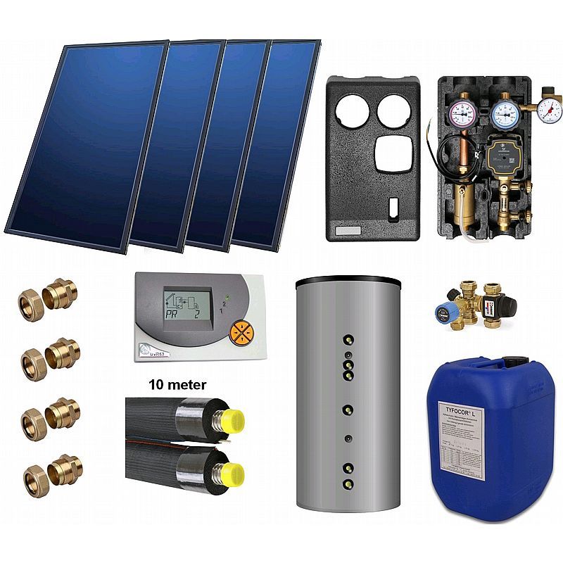 Solvarmesæt med 300 L beholder til brugsvand og rumopvarmning. Dette komplette solvarmesæt er designet til familier på 4–6 personer og giver både varmt brugsvand samt supplement til rumopvarmning. Solvarmeanlægget leveres med en 300 liters solvarmebeholder og 9,88 m² flade solfangere. Beholderen er udstyret med topspiral, som gør det muligt at supplere opvarmning fra olie- eller gasfyr, brændeovn eller masseovn. I elopvarmede hjem kan der monteres en elpatron til suppleringsvarme, så der altid err varmt vand, også på dage med lav solindstråling.