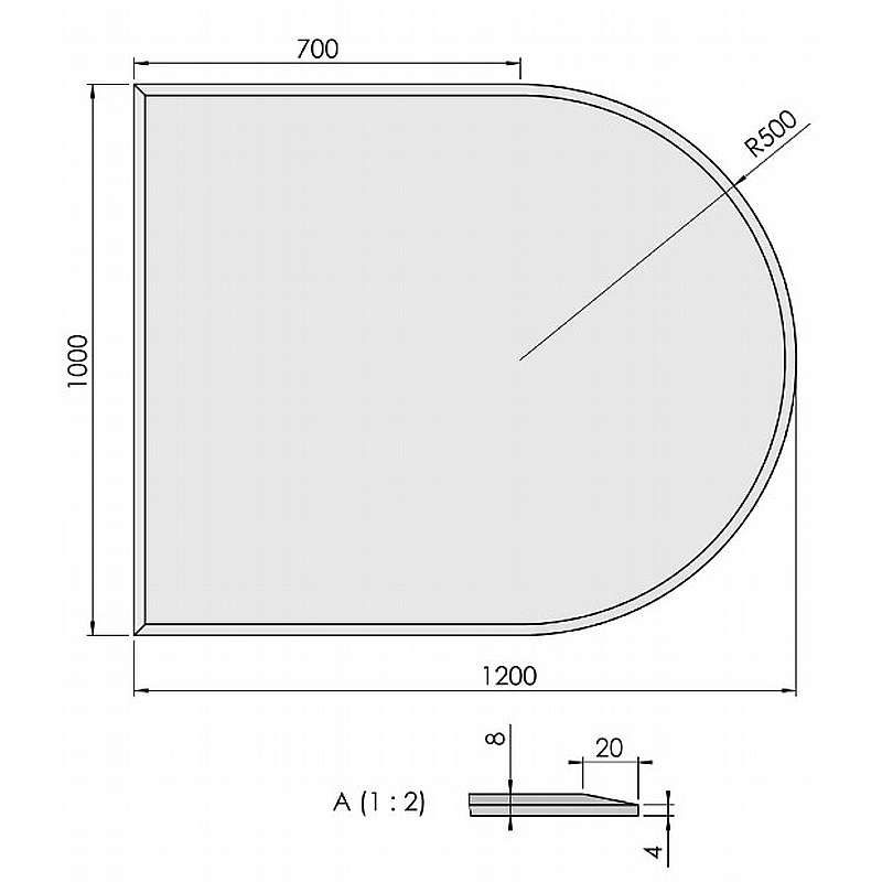 Halvrund glasgulvplade m.facet - 8mm - A:100 x B:120cm