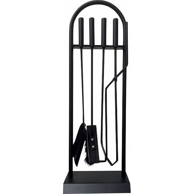 Meget enkelt og klassisk look. Den runde halvbue indrammer de 4 redskaber og den firkantede fod afslutter fint rammen nederst. Den store firkantede fod stabiliserer og sættet står meget stabilt på gulvet. Redskaberne er holdt helt enkle og alt er pulverlakeret sort.