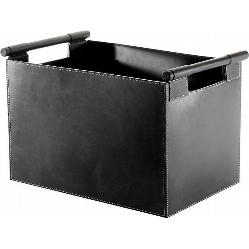 Firkantet brændekurv, sort læder med sorte håndtag. Denne utrolig flotte og helt nye model er meget elegant at se på. Det helt sorte og meget smukke design, den måde hvorpå håndtagene er vedhæftet brændekurven med firkantede påsyede læderstykker,- gør den ekstra elegant at se på. Den særlige finish med de flotte hvide syninger rundt på alle læderkanterne indrammer på smuk vis denne sorte læder kurv.