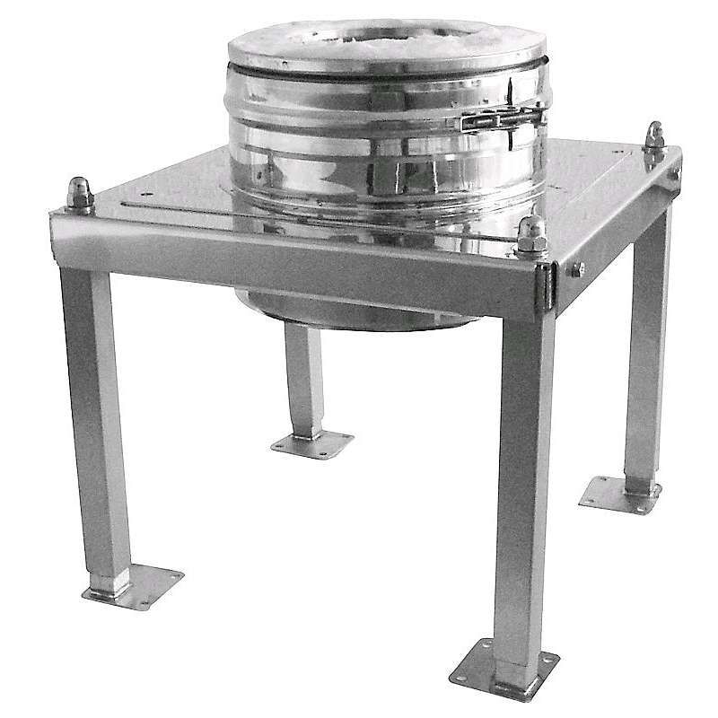 Teleskopiske gulvbæring som kan justeres i højden 350 mm - 600 mm. Man kan placere den teleskopiske gulvbæring bag ildstedet hvor det ønskes. Højden er justerbar og bæringen kan fastlåses i den ønskede højde. Er der et behov for en større/stor højde, er det muligt at indskyde en skorstenslængde mellem gulvbæringen og T-stykket. Ved at fjerne proppen, kan der foretages inspektion/fejning ved at fjerne proppen. Denne er monteret under gulvbæringen. Låsebånd medleveres. Excl. T-stykke.