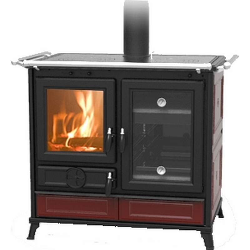 Beskrivelse: Lav mad på den gamle klassiske måde på et komfur der varmes op med træ og få samtidig den smukkeste brændeovn ind i dit køkken. Bag en pizza i den øverste ovn og en tærte på samme tid i den nederste ovn – med forskellige temperaturer. Denne helt specielle model er kræs for de som elsker at lave rigtig god mad og som elsker deres køkken. For ganske få midler, kan man få begge dele. Dette super smukke komfur med en meget høj virkningsgrad, er helt gennemført og er lavet i gode materialer som stål og støbejern. Der er 2 integrerede ovne, der fungerer uafhængigt af hinanden. Ovnen kan indstilles til forskellige temperaturer og den øverste ovn, kan opvarmes til en meget høj temperatur. Dette er kræs for en madelsker. Der er integreret lavastensbund i begge ovne, som også er emaljeret. Hele designet er gennemført med brændkammer til træ til venstre, de 2 ovne til højre og kogeplader i toppen. Brændekomfuret fungerer også som brændeovn og kan opvarme 100 – 150 kvm. Store keramiske glasruder i front med indbyggede termostater, rustfri flot afrundet topplade i stål samt Cool Touch håndtag. Øvre ovn har en kapacitet på 14 L og den nedre ovn har en kapacitet på 35 L. Toppen er lavet i emaljeret støbejern og det samme er forbrændingskammeret. Kogepladerne er i glat støbejern er er en dobbelt serie af støbejernsringe, som er lette at holde rene pga. overfladen. Det er muligt at regulere primær og sekundær samt teritærluft. Kabinettet er i støbejern med malede stålsider.