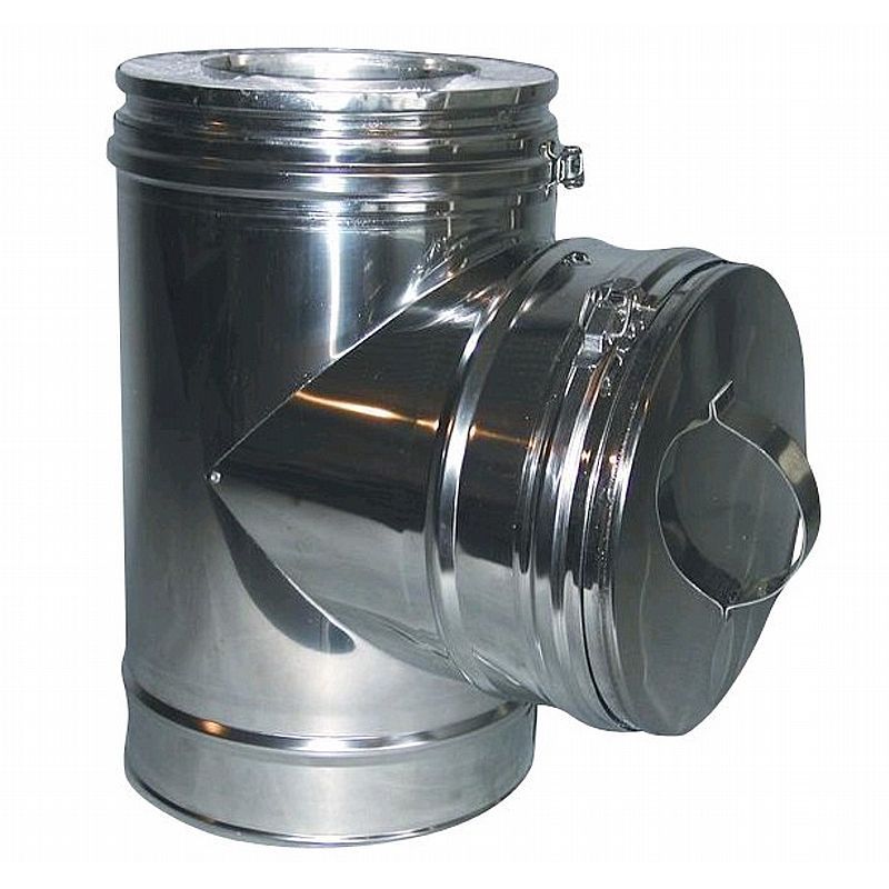 T-stykke 90° med sodskål og aftap- T-stykker kan både bruges til skorstene der er opstillet udendørs som tillige indendørs i forbindelse med vægbæring. T-stykket sammensættes med en skorstenslængde og føres sikkert igennem mure/vægge. Der er sodskål i bunden af T-stykket hvorved der kan foretages inspektion samt rens. Hvor skorstenen monteres direkte oven på kedlen, kan T-stykke indskydes under eller over taget, hvis der kræves rensemulighed.