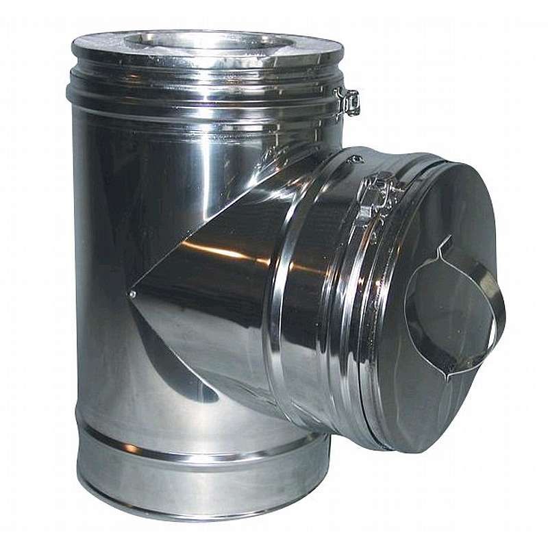 T-stykke 90° med sodskål og aftap. Kan både bruges til skorstene der er opstillet udendørs som indendørs i forbindelse med vægbæring. T-stykket sammensættes med en skorstenslængde og føres sikkert igennem mure/vægge. Der er sodskål i bunden af T-stykket hvorved der kan foretages inspektion samt rens. Hvor skorstenen monteres direkte oven på kedlen, kan T-stykke indskydes under eller over taget, hvis der kræves rensemulighed.