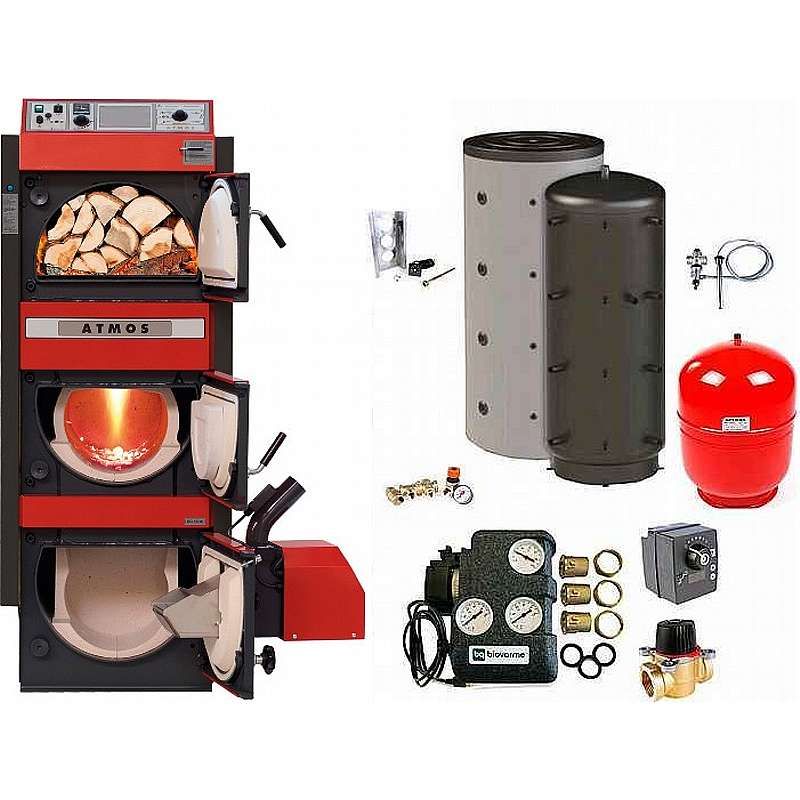 Atmos DC18SP kombifyrsæt - 18kw - med træpillebrænder, snegl og 500l silo, akkumuleringstank, ladeventil m.v.