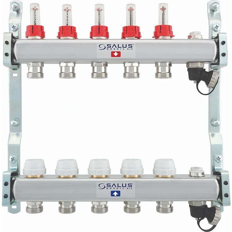 Salus gulvvarmemanifold med 9-kredse med flowmeter samt koblingssæt til 20 mm PEX-rør. Sættet indeholder rustfri stålfordeler, der er indstillet med flowmåler samt med koblingssæt til 20 mm pex/pe-rt rør og ventillationsventil på indløb og retur. Sættet indeholder tillige drejeledsfyldning og drænkraner samt monteringsbeslag til vægmontering.