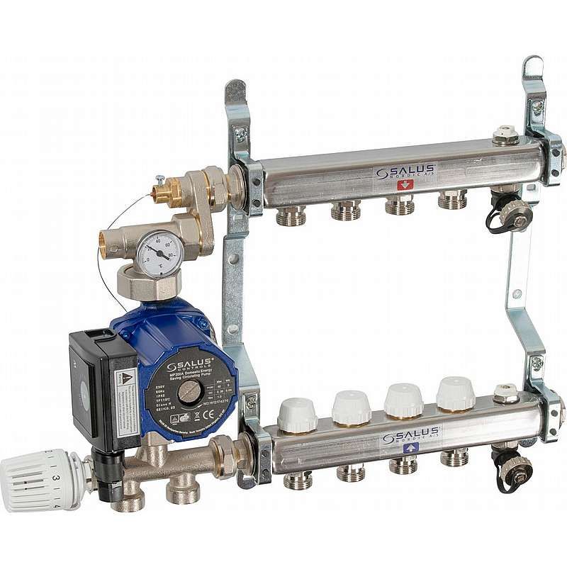 Salus gulvarme unit 7-kredse med shunt og fordeler. Gulvvarmefordeleren er en high flow fordeler med manuel afbalancering af hver kreds. Komplet gulvvarmeløsning til gulvvarme. Denne unit består af shunt, gulvvarmefordeler og cirkulationspumpe 6 m, bygget sammen i en enhed.