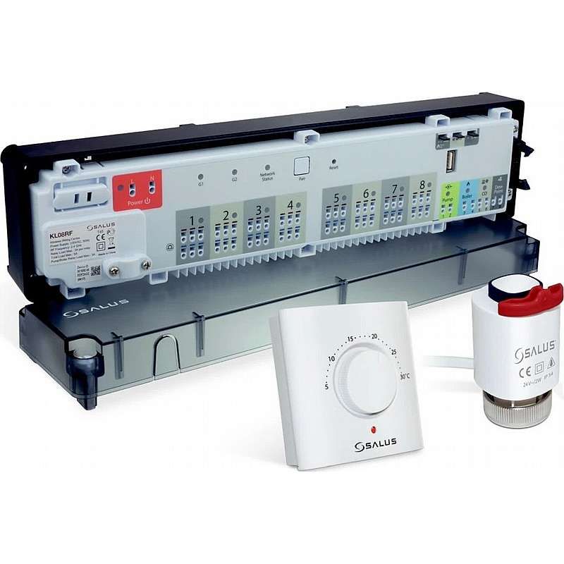 Salus gulvvarmesystem opparret og klar til brug - 6 Zoner. Sammen med Salus GVU (tilkøbes) der er en komplet gulvvarmeshunt-løsning til gulvvarme med shunt, gulvvarmefordeler samt cirkulationspumpe sammenbygget i en enhed får man her en løsning der er mere enkel at montere. Ved at vælge et på forhånd opparret gulvvarmesystem er fordelen at installationen er mere enkel og meget overskuelig. Her er de trådløse forbindelser på forhånd forbundet og rumtermostaterne er opmærket. Derved kan man se hvilken zone/kreds at rumtermostaterne er forbundet til. Systemet kan til enhver tid udvides ved at tilføje yderligere telestater og eventuelt rumtermostater.