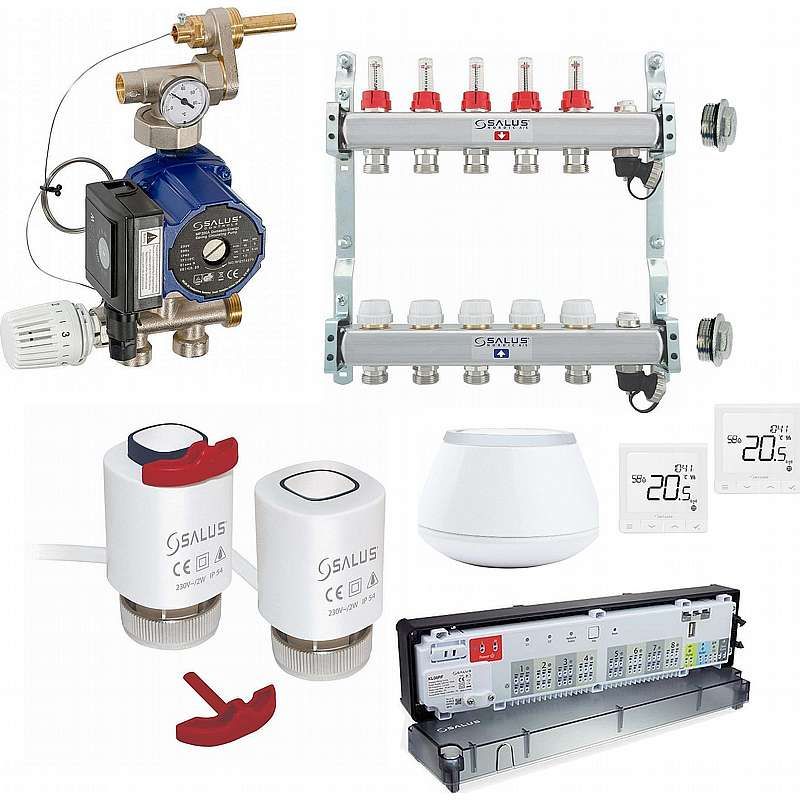 Salus Gulvvarmesystem (8 Kredse) komplet. Smart Komplet gulvvarmesystem med Wi-Fi til 8 kredse. Salus gulvvarmesystem leveres med flowmeter og rumføler samt styring. Salus gulvvarmesystem kan styres direkte fra en smartphone, PC samt fra tablet via Salus Smart Home App.