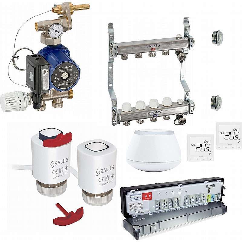 Komplet Salus gulvvarmesystem (12 Kredse) med styring og rumføler. Smart styring via en smartphone, tablet eller PC via Salus Smart Home App. Her er en komplet gulvvarmeløsning med gulvvarmefordeler, shunt samt 6m cirkulationspumpe der sammenbygget i en enhed.