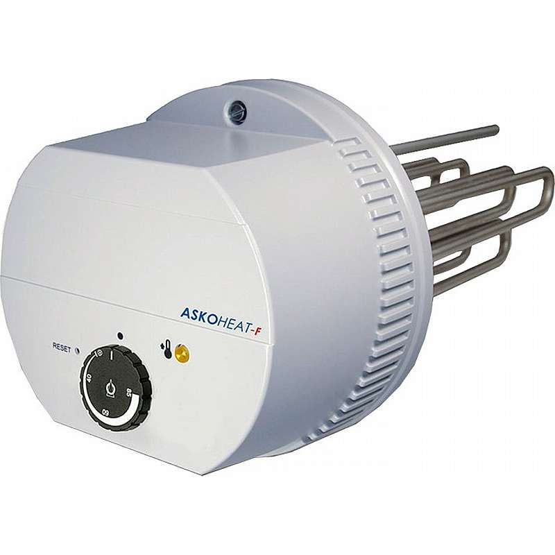 El-patron Ø180 mm. Elpatronen med horisontalt, altså vandret montering. Selve patronen består af 3 U-formede varmelegemer. Disse varmelegemer er presset ind i en nippel. Sammen med et dykrør, er disse monteret på en stålflange. Som isolering er der anvendt en kunststofskive. Denne kunststofskive kan anvendes til brugsvand. Elpatronen skal være helt dækket af vand og der skal være fri vandstrøm omkring elpatronen. Ikke opvarmet zone 70 mm.